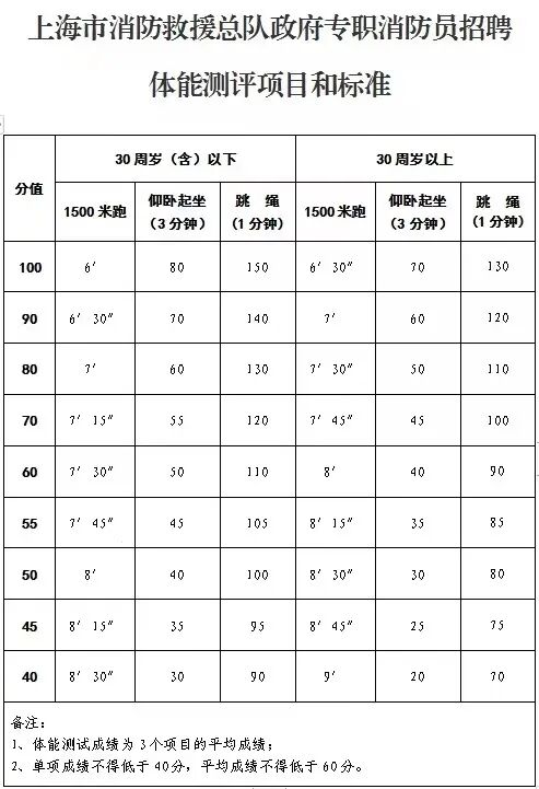 2、体能测试。体能测试具体标准详见《上海市消防救援总队政府专职消防员招考体能测评项目和标准》。