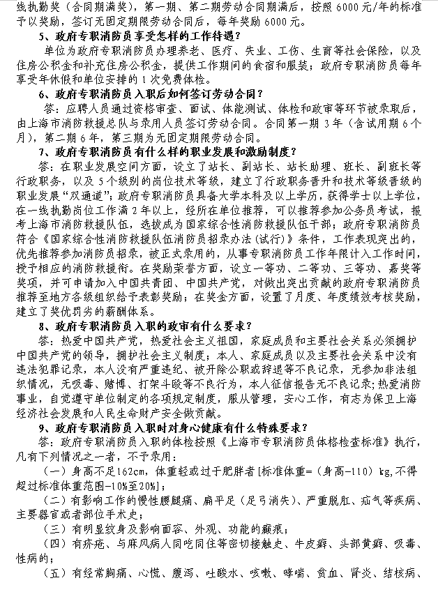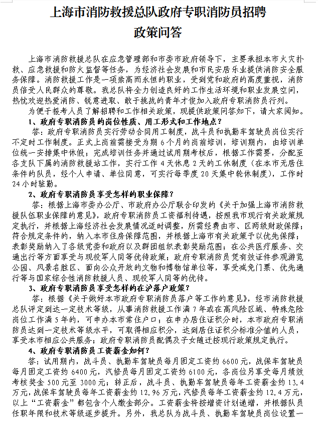 招聘政策详见《上海市消防救援总队政府专职消防员招聘政策问答》;