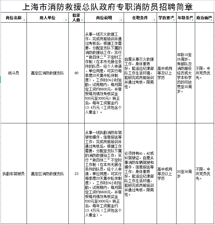 具体岗位和薪酬情况详见《上海市消防救援总队政府专职消防员招聘简章》;