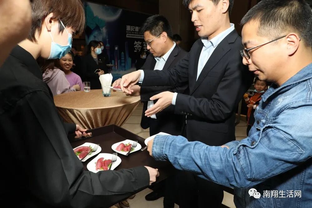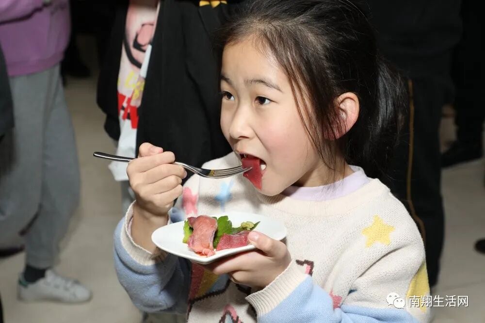 蓝鳍金枪鱼肉富含蛋白质、EPA、DHA、维生素等营养价值,开鱼仪式结束后,宾客在品尝金枪鱼肉。