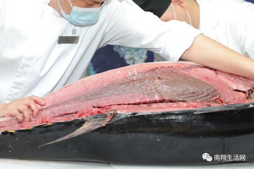 蓝鳍金枪鱼在美食界享有“劳斯莱斯”称号,更有“刺身之王”美誉的金枪鱼珍贵品种,其生长环境处于深海不受污染,富含营养且口感极优,价格也极其昂贵,腹部肉更是达每斤数千元。本次采用的这条蓝鳍金枪鱼重74公斤,鱼身长1.55米,价值近3万元。