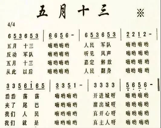这首《五月十三》歌曲,是嘉定县中地下党员为迎接嘉定解放,在解放前夕集体谱写的,并在嘉定解放之日尽情歌唱。