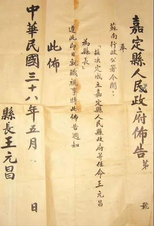 1949年5月26日,中共嘉定县委和嘉定县人民政府在公共体育场举行嘉定解放庆祝大会,王元昌主持大会并宣读了嘉定县人民政府成立布告。布告宣读后,即在全县张贴。当天,县政府门口挂出“嘉定县人民政府”的牌子,政府各工作部门即日起开始办公。