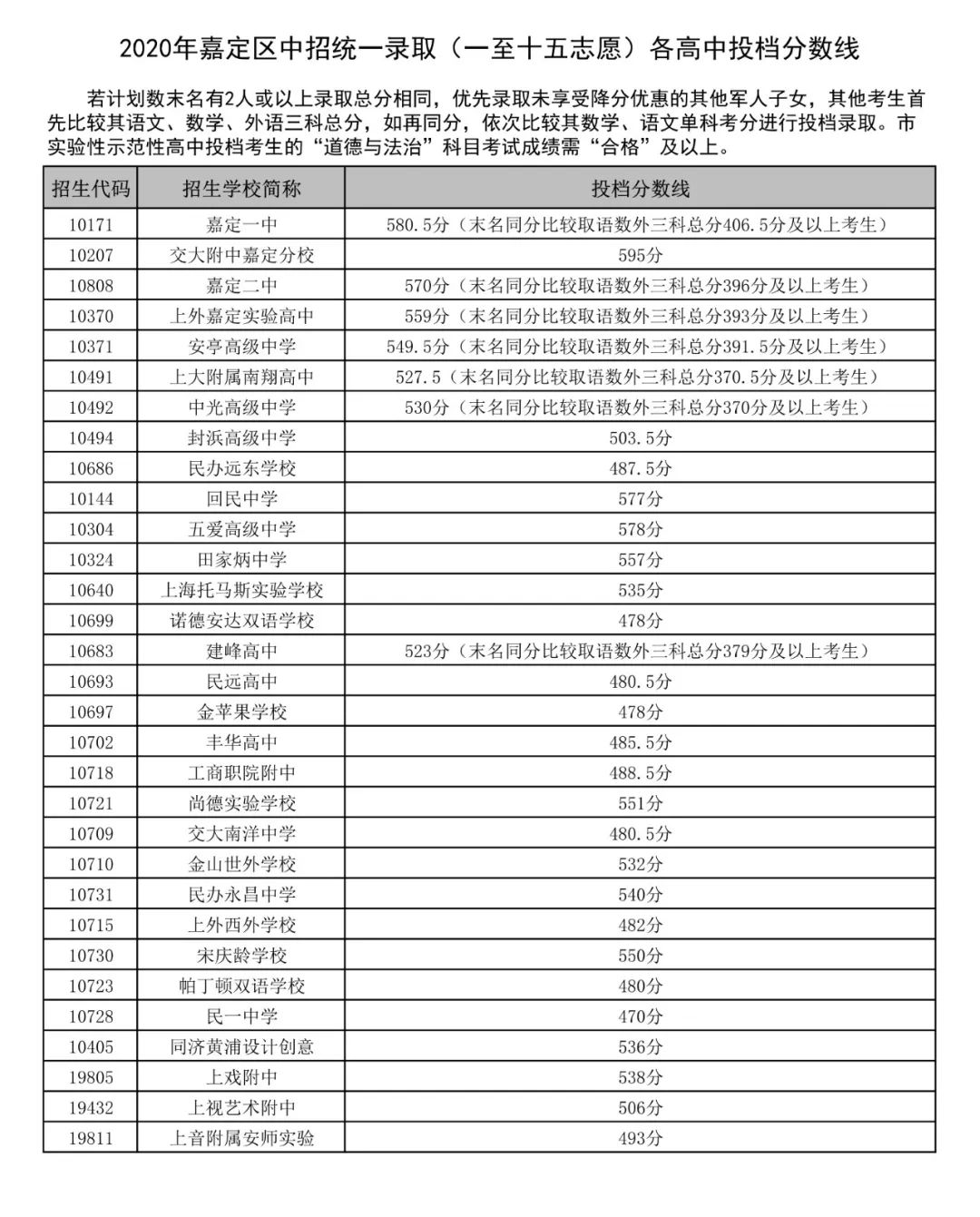 2020年嘉定区中招统一录取(一至十五志愿)各高中投档分数线公布!若计划数末名有2人或以上录取总分相同,优先录取未享受降分优惠的其他军人子女,其他考生首先比较其语文、数学、外语三科总分,如再同分,依次比较其数学、语文单科考分进行投档录取。市实验性示范性高中投档考生的“道德与法治”科目考试成绩需“合格”及以上。
