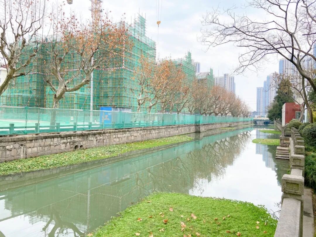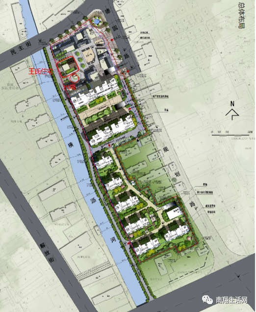海伦堡项目规划用地东西宽约85m,南北长约330m,地理位置没的说,整体呈长条形,位于嘉定重要的南北水系——横沥河轴线上,坐拥南翔老街和古猗园两大4A景区,这放在正在上海也是很罕见的。也算得上好事多磨,从计划开发到现在部分建筑封顶已经过去多年,原因很多,其中有个重要原因是在项目区块内有近百年历史的保护建筑王氏住宅(始建于1929年)及水塔。