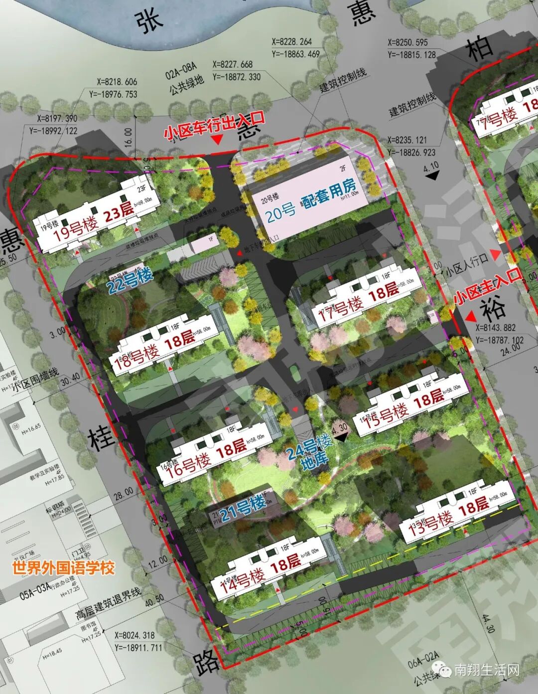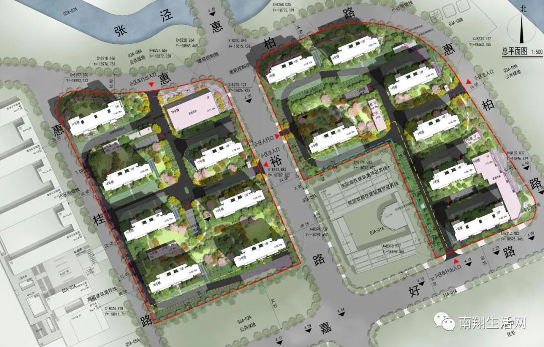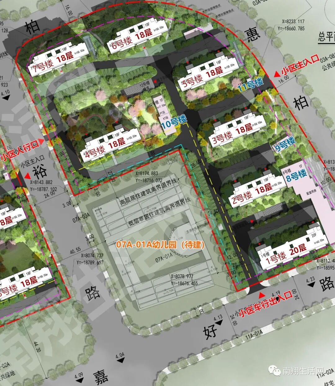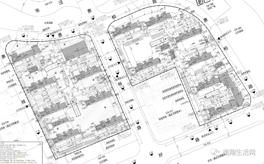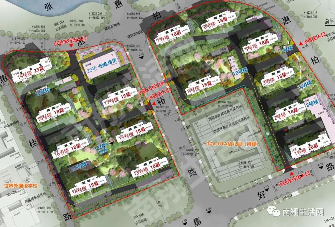 我们可以清晰看到,06A-01A、07A-02A地块被惠裕路分为东西两部分,拟建14栋住宅(东、西两部分各有7栋)。主入口分别位于惠柏路和惠裕路,车行入口位于嘉好路和惠柏路。
