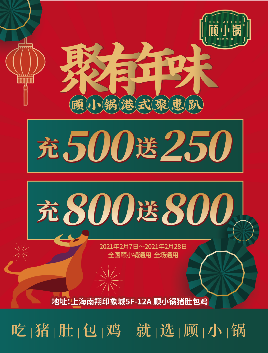 名词解释:为了响应国家春节“原地过年”号召,顾小锅发起“聚有年味”的福利活动,正宗港式美味春节不打烊,5折起充值,红包天天送!让每个“原地过年”的游子,过个年味不减的好年。