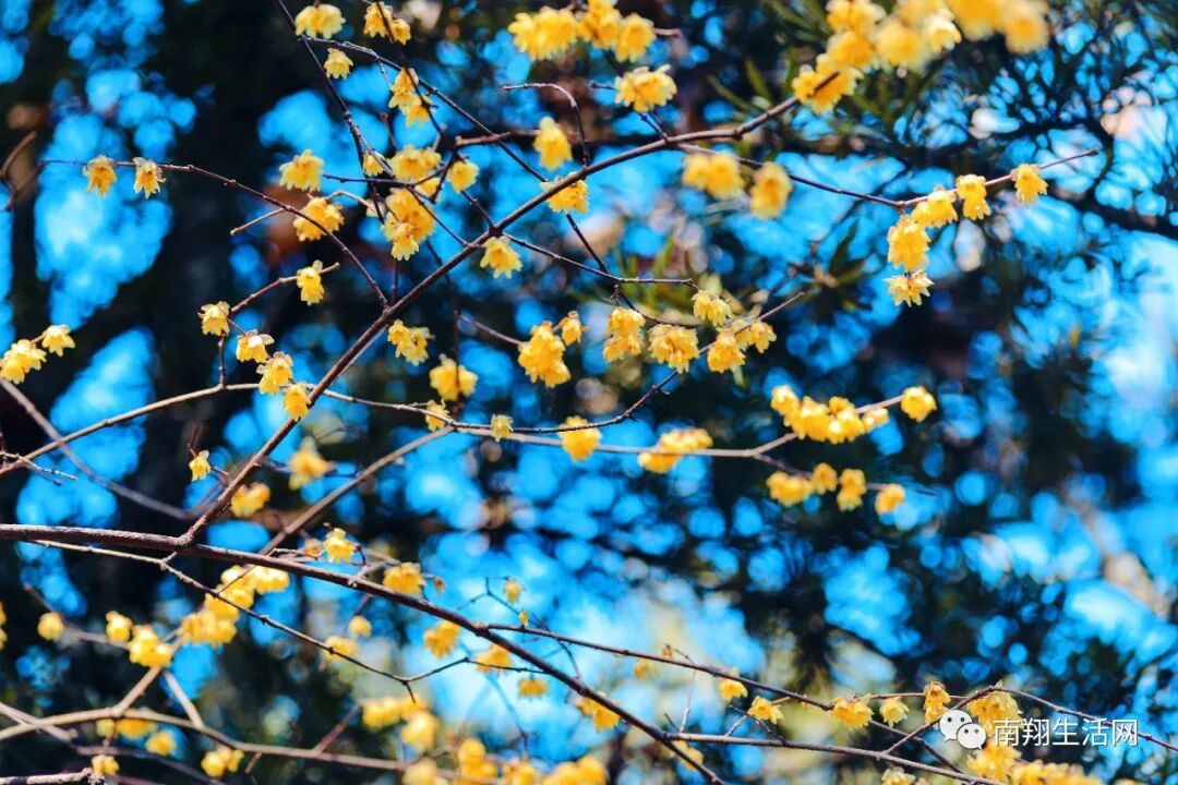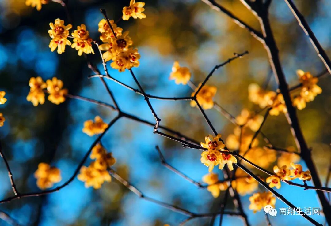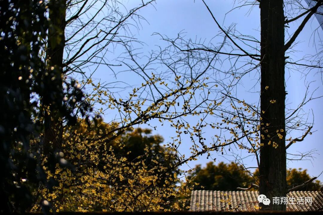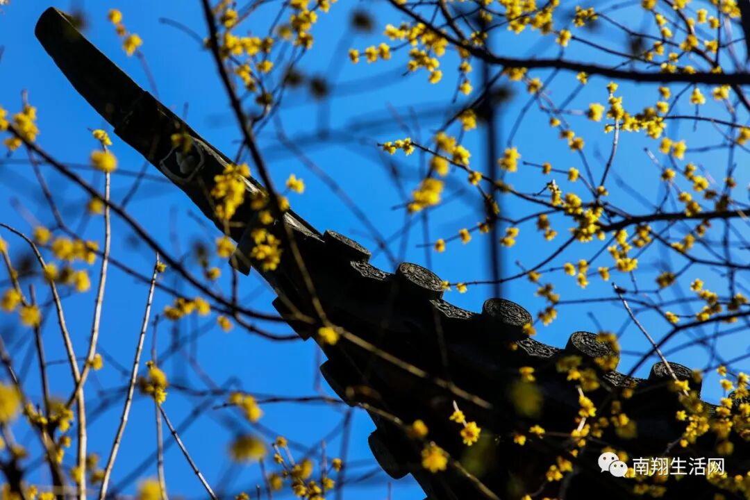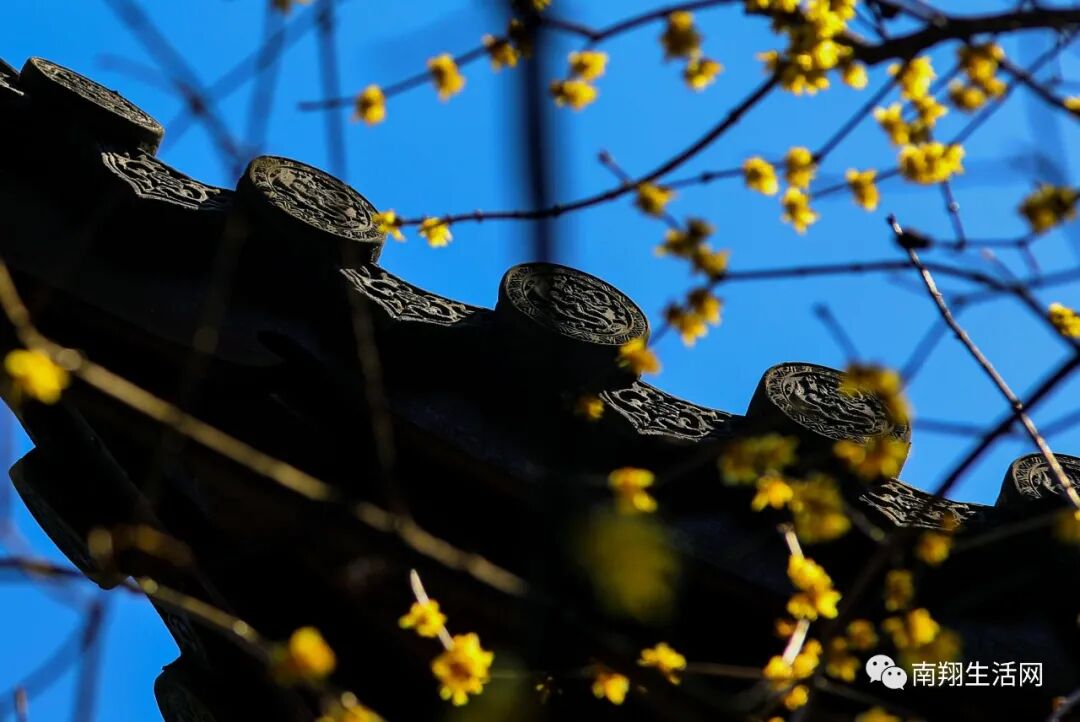腊梅还没有凋谢,碧蓝天宇下,与飞檐下的滴水瓦共融成趣。