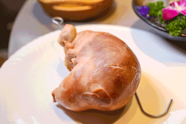 500g以上的新鲜大猪肚才能包住一整只鸡,剪开先取“发财蛋”,仪式感十足,吃完一定好运连连。