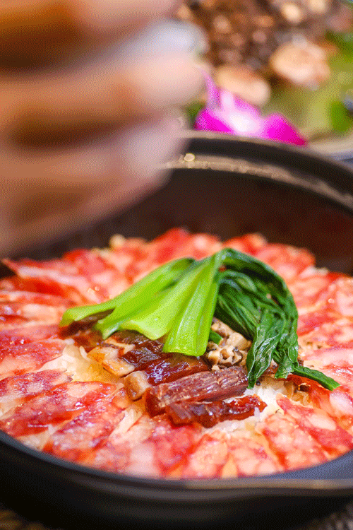吃猪肚鸡怎么少得了一份煲仔饭,铺满腊肠和腊肉的煲仔饭一上桌就香气逼人。淋上秘制酱油以后,将锅巴和米饭拌匀,一锅plus版的煲仔饭都分分钟被抢光。