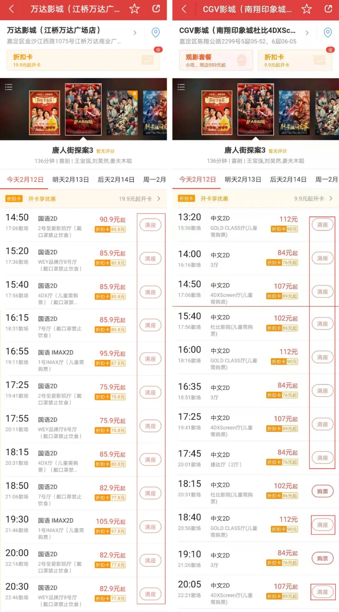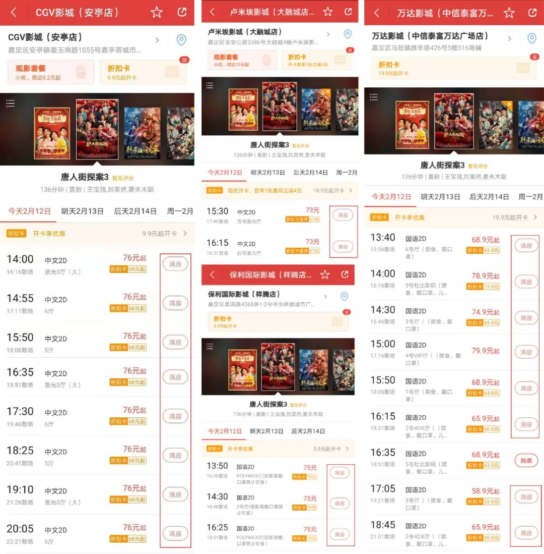 大年初一,春节档在唐探3领衔下众多大片上映,嘉定各大商业体电影院爆满!究竟有多火爆?小编查询了猫眼APP上的购票情况,从下午到晚上的观影时间段里售票基本爆满!