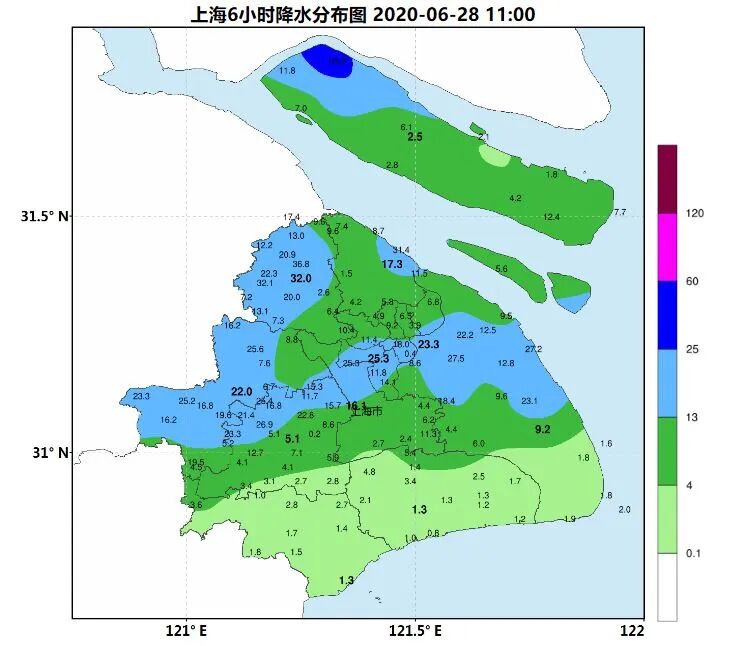 28日夜里至29日过程累积雨量20~40毫米,西部和北部地区50~70毫米,小时最大雨强30~40毫米;29日下午雨势逐步减弱。