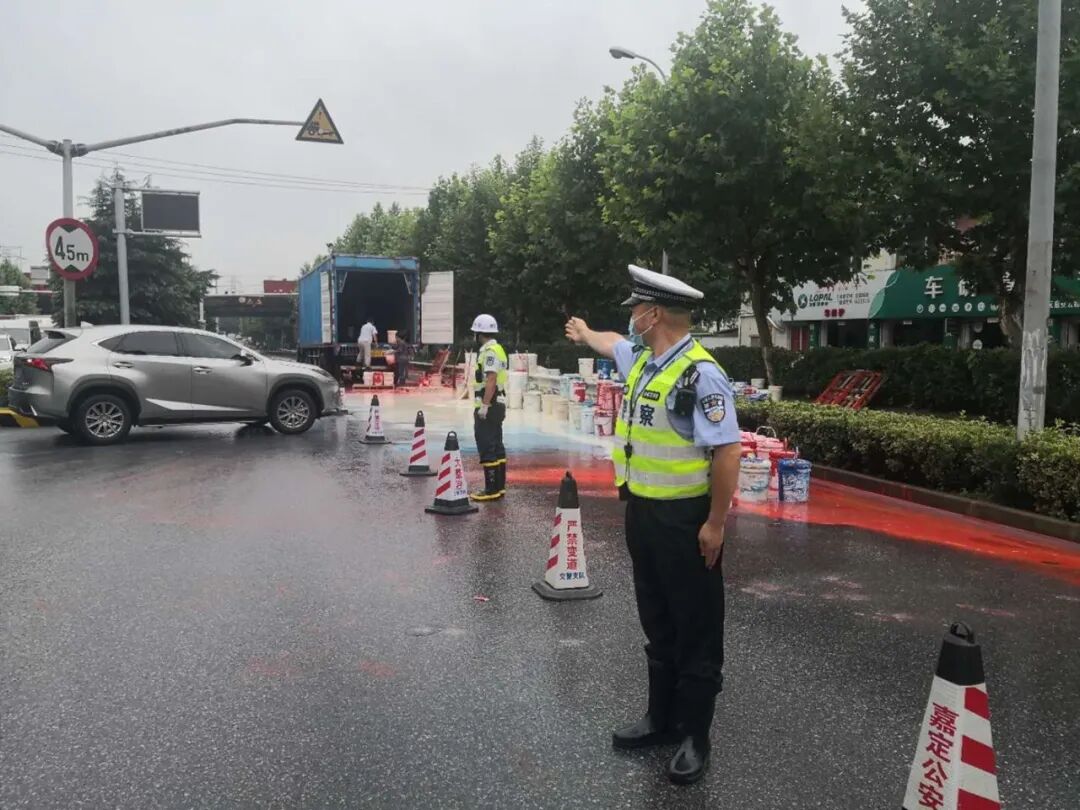 ▲ 交警支队机动二大队迅速赶赴嘉安公路回城路口,配合叶城所处置一起大货车油漆倾翻事故