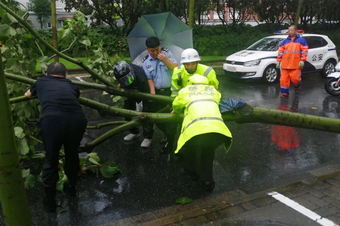 ▲ 唐行所民警前往唐窑路连俊路口附近,及时清除倒下的树木,维持现场秩序,确保来往车辆的行车安全