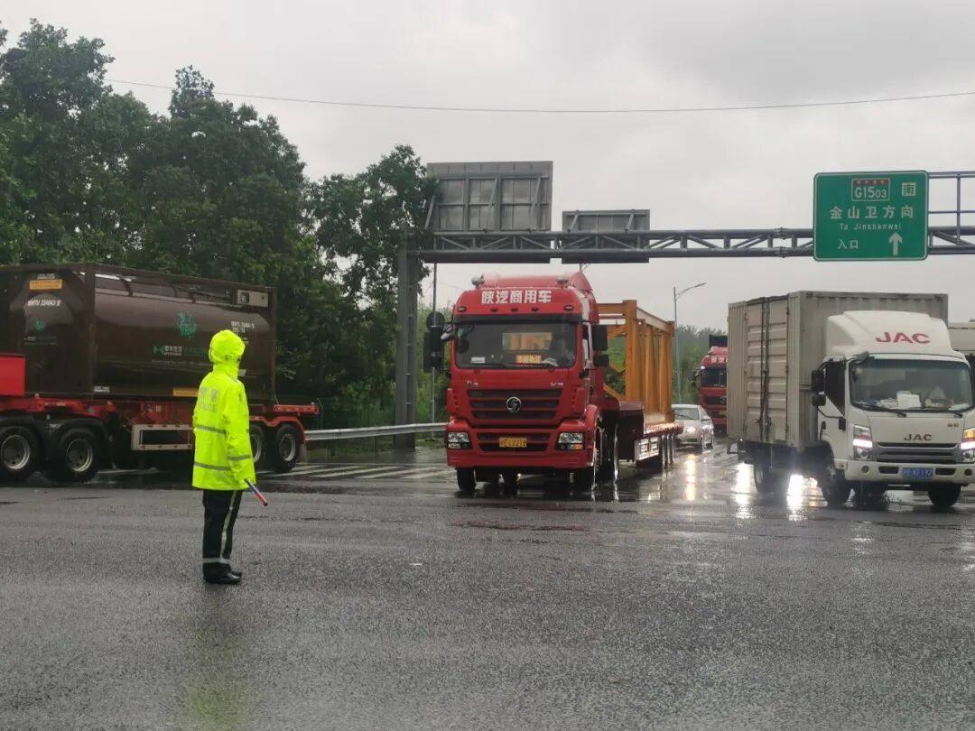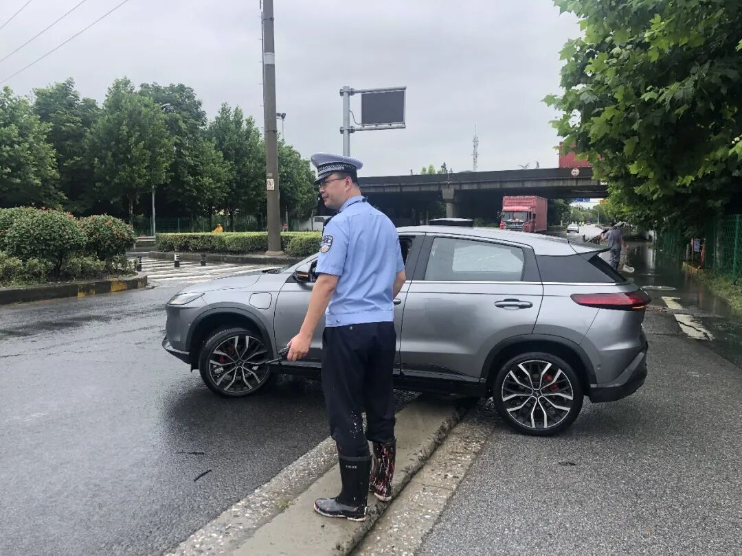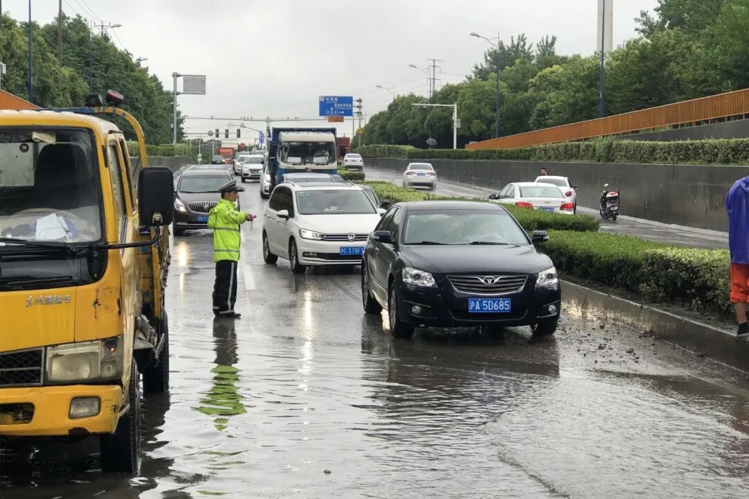 ▲ 江桥所辅警在高潮路G2桥洞维持交通秩序,阻止群众进入积水路段