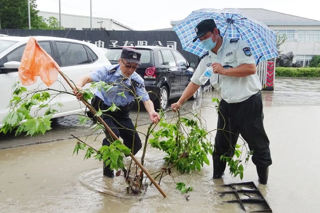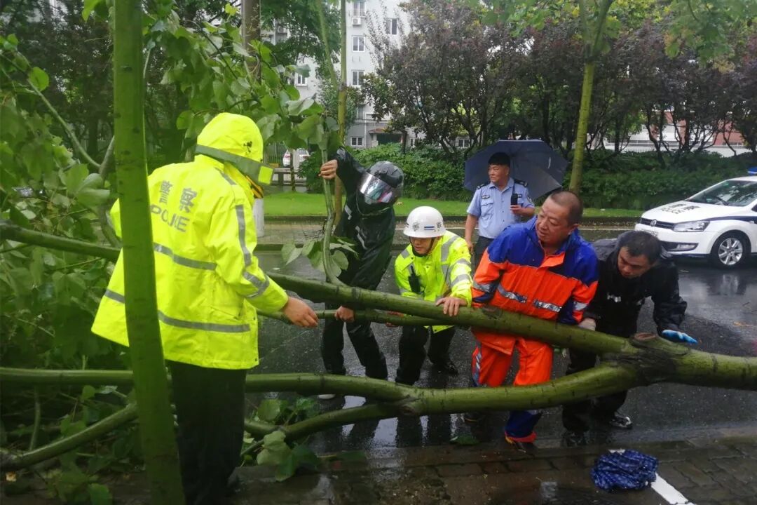 ▲ 嘉城所民警在巡逻过程中,发现东大街东大小区门口附近有树木折断拦在路中,立即组织队员一同将树木移至路边,确保来往车辆正常通行