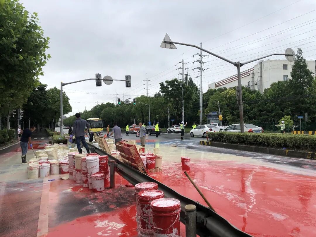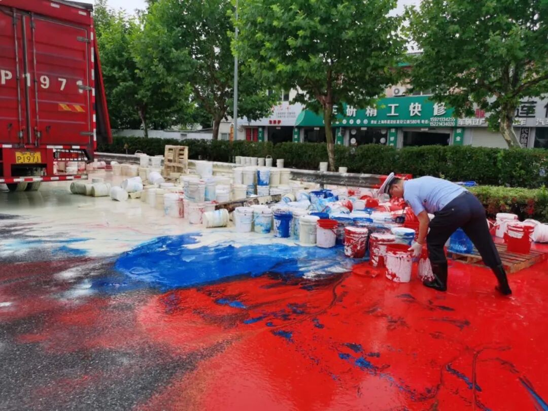 ▲ 嘉安公路回城路口发生一起交通事故,货车油漆倾翻导致道路拥堵,叶城所迅速反应,第一时间赶至现场搬运油漆桶,疏通周边交通