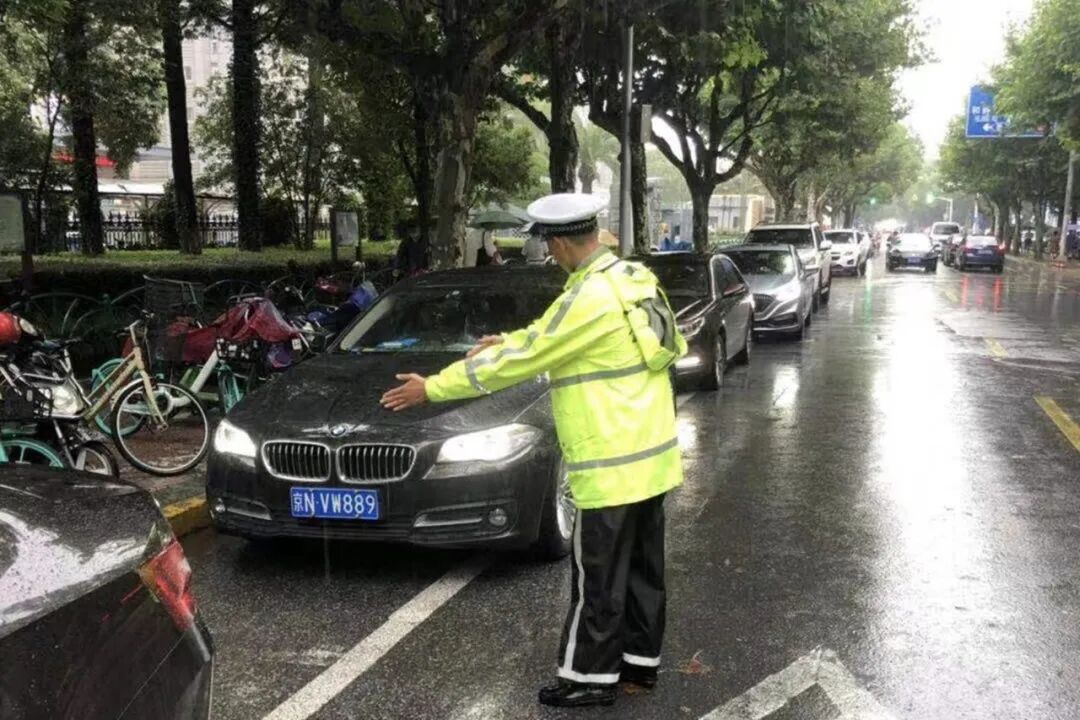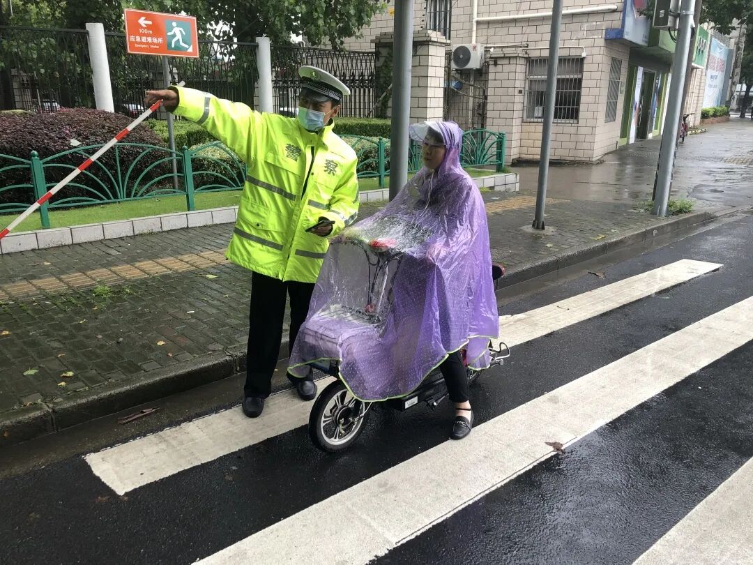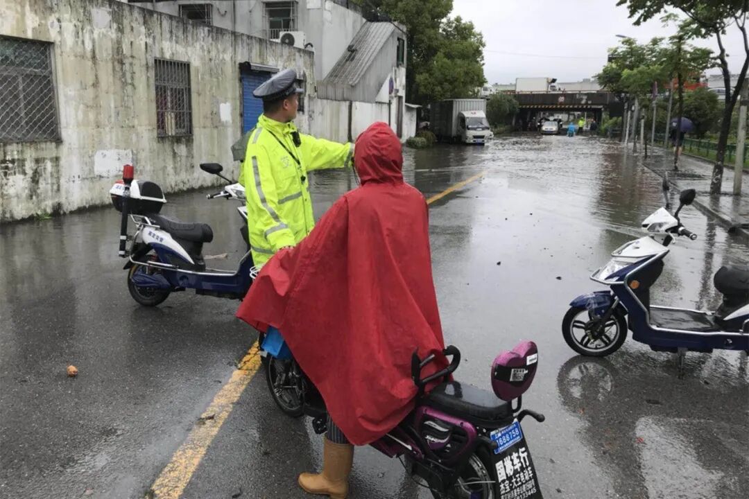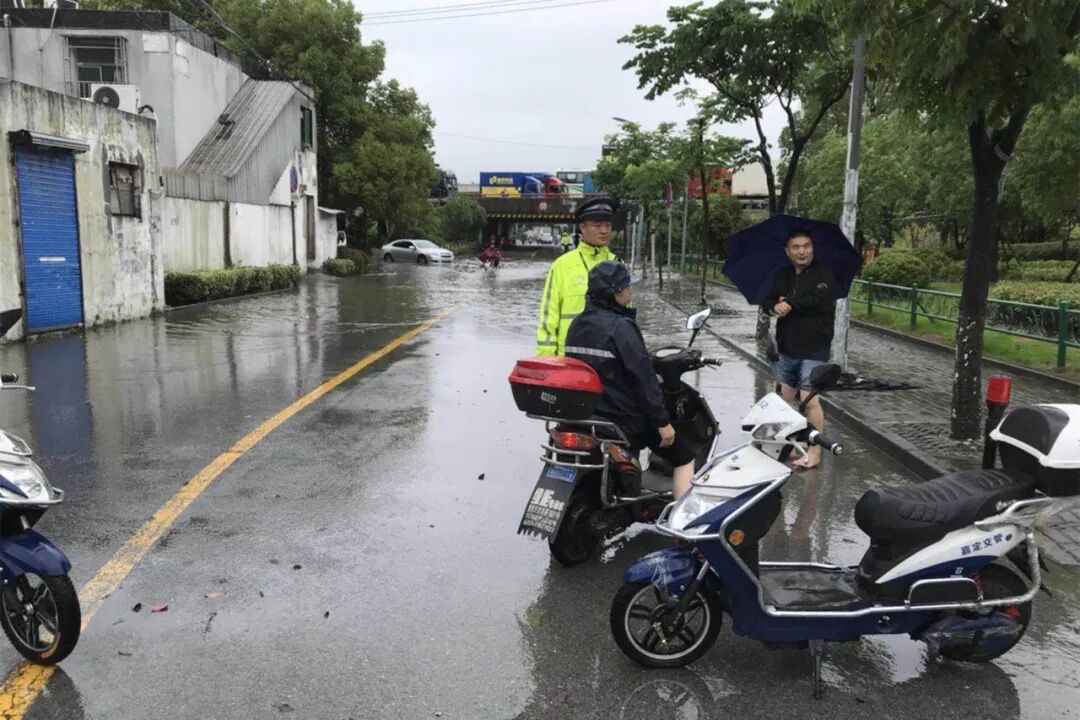 ▲ 黄渡所民警在新黄路春亭路口指挥过往非机动车避开积水路段