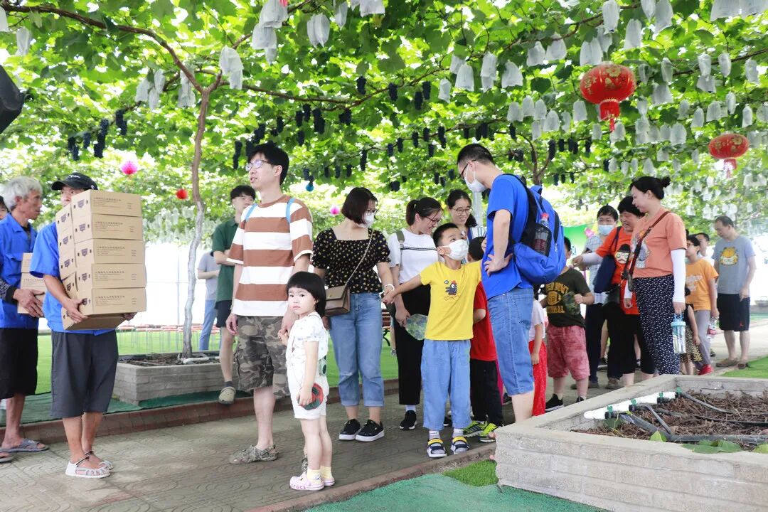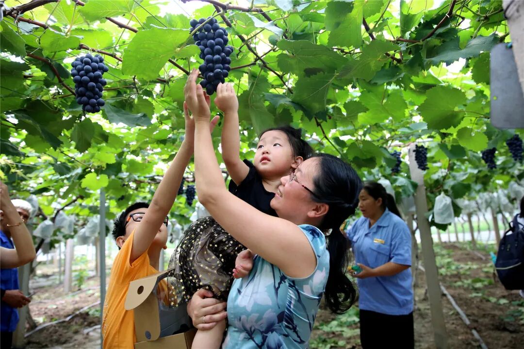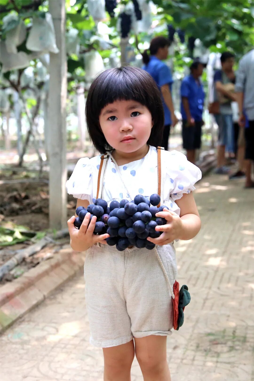 绿似碧玉、红若玛瑙、紫如水晶……一步入葡萄采摘园,就能感受满园葡萄飘香。     萌娃们瞬间化身“田园小农夫”,有模有样地享受着采摘的乐趣。