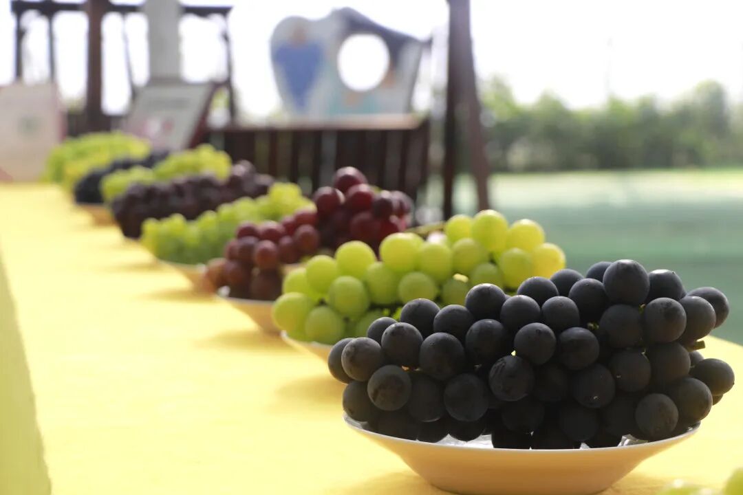 剪彩活动是个亮点,没有用惯常的红球绸布,而是在38年树龄的“千斤葡萄王”树下用葡萄来剪彩。