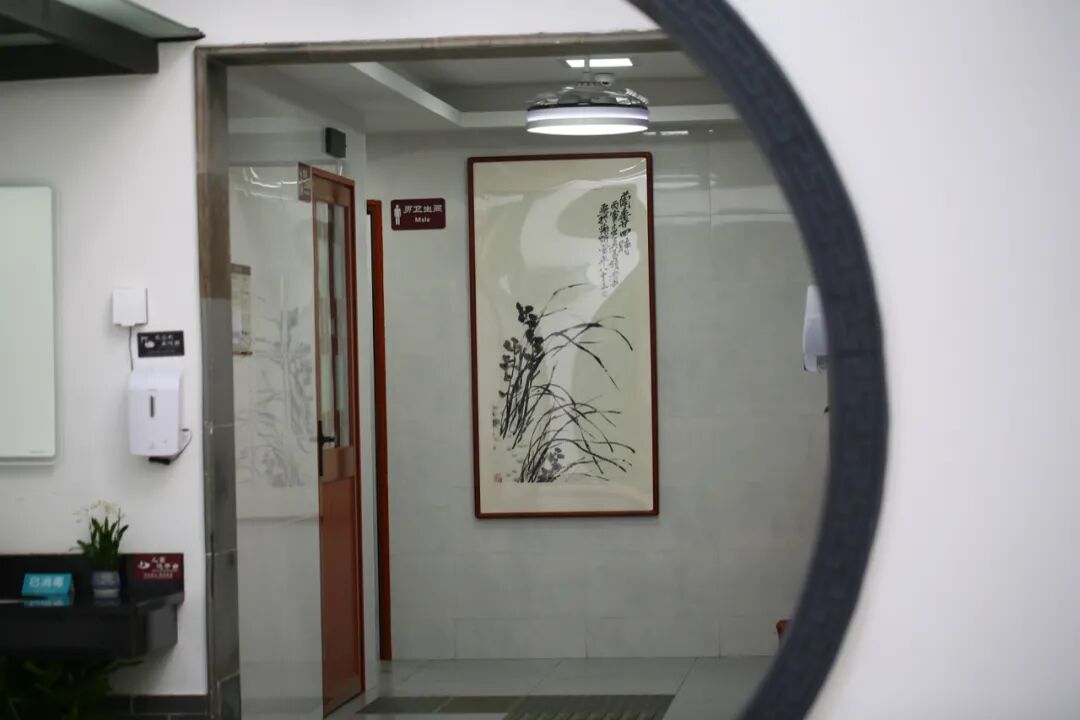 南门厕所还是以“兰花”为主题文化厕所,从外墙上的砖雕、玄关处的壁画到厕位间的垃圾桶,都描绘着雅致的兰花。