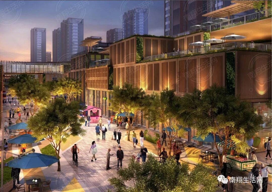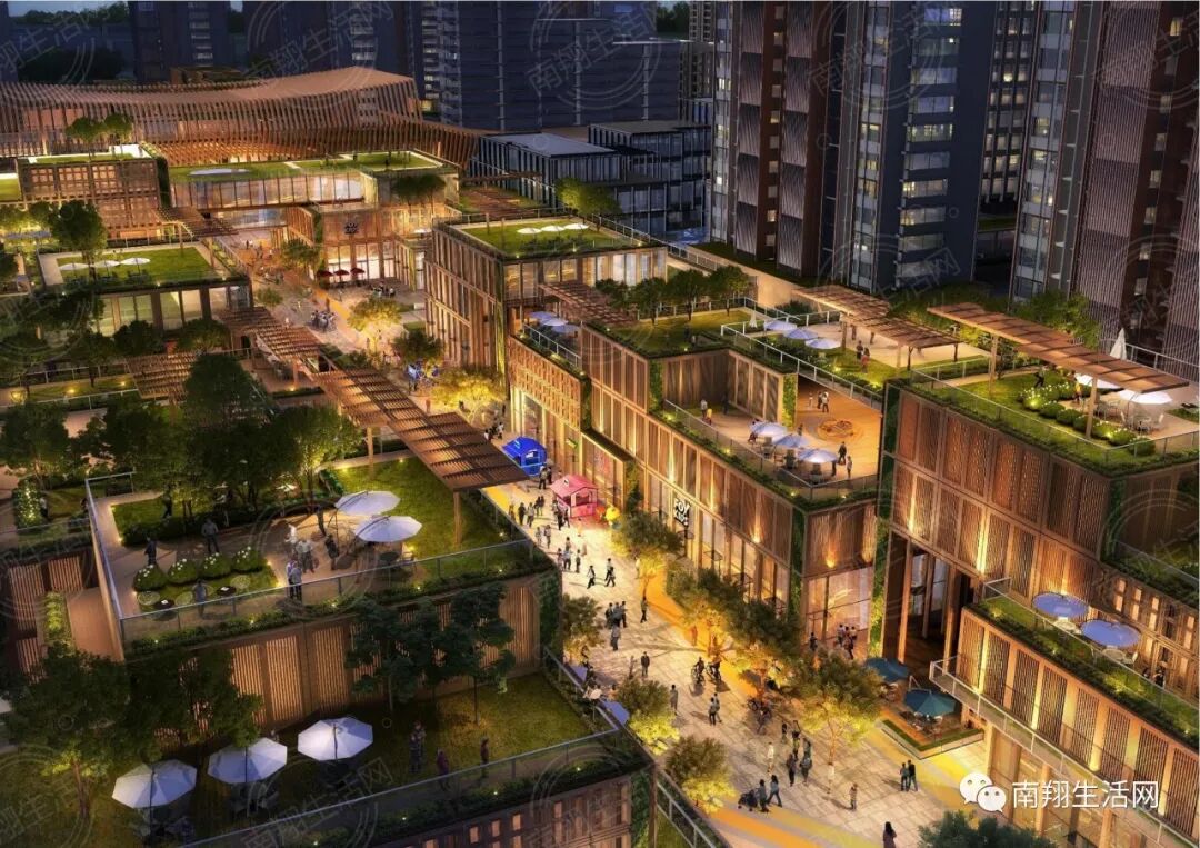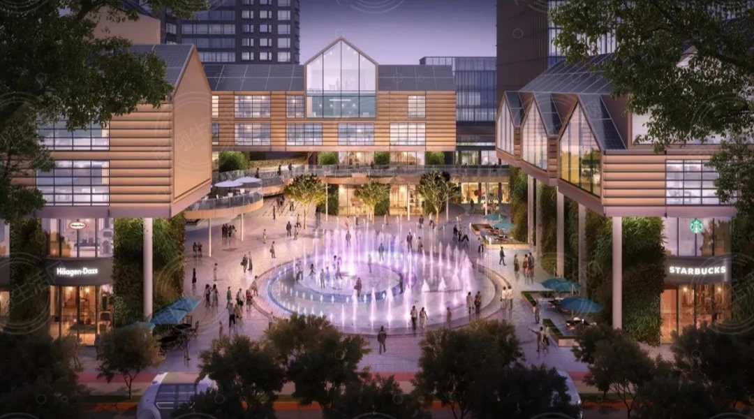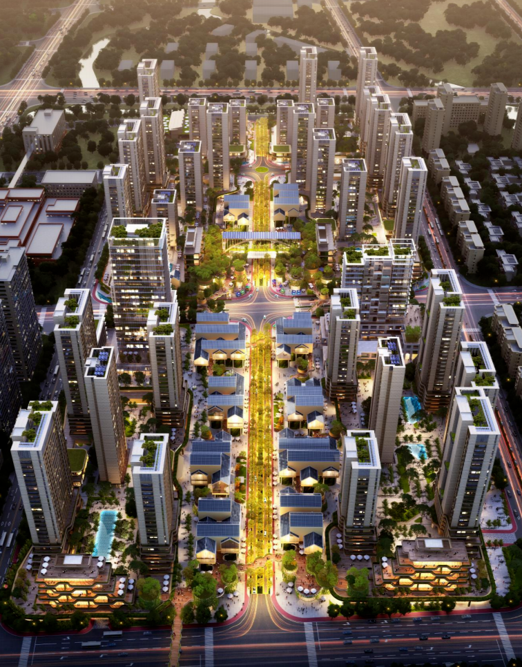 而若将图片聚焦,则很有新天地或者大学路感觉——低层的是景观商业,后面则是高层的住宅和办公,住宅项目多采取南北布局,而办公则安置于住宅中间,主面东西方向。