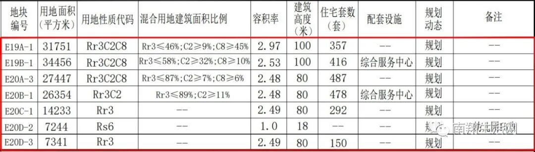 据悉,地块将涉及新建幼儿园(E20D-2地块)、天际线景观打造、跨地块二层连廊体系、生态低碳规划等。   为了让大家更清晰了解,小编在地图上进行了规划图和地块参数的叠加标注:   7月15日,比选方案开始公示,共有2家入围。小编首先注意到,两家设计方案的的总建筑面积稍有差异:   其中方案一的总建筑面积为577043.3平米。