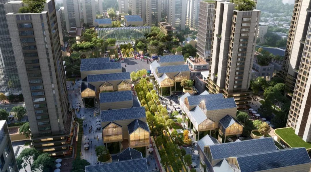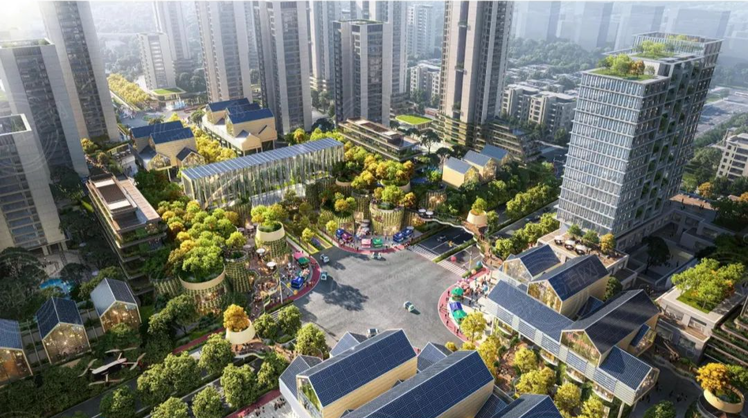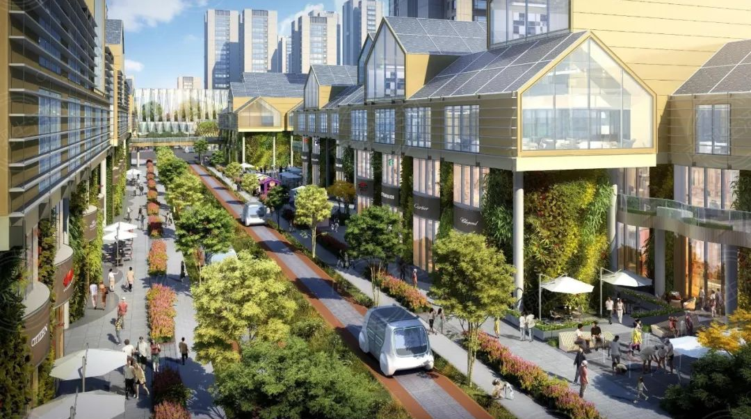 商业街区局部意向图,十分未来感。而大面积的绿化和采光,也符合地块绿色环保的要求。