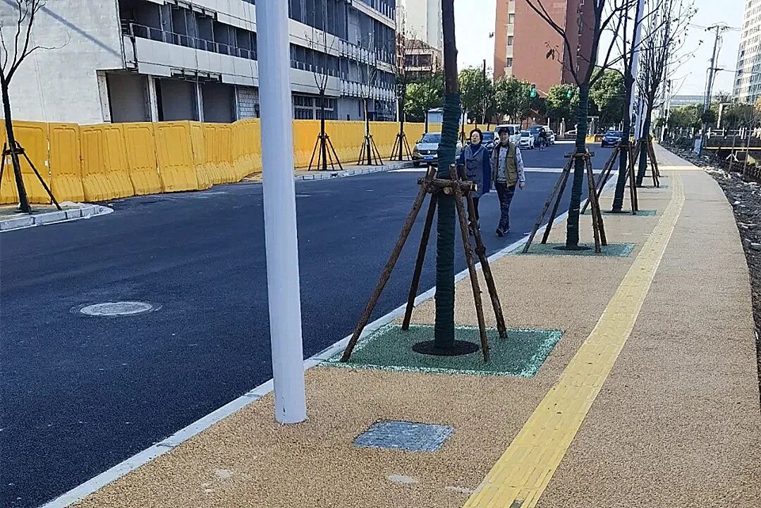 值得一提的是,听雪园路的人行道铺设采用了胶粘石工艺,不仅美观,雨季还可以及时将雨水渗入地下,可有效减少路面积水。
