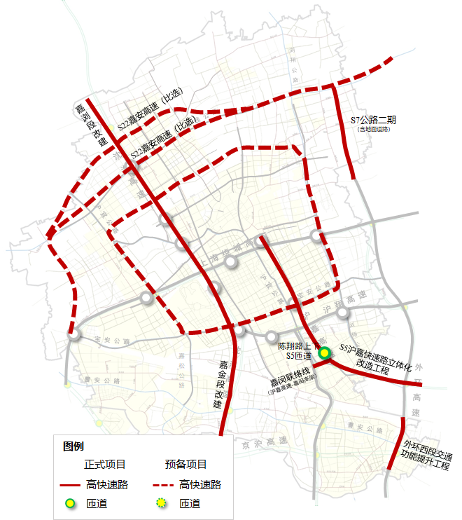 完成S7沪崇高速二期高架、地面道路建设,新建嘉闵-沪嘉联络线(含陈翔路上下S5匝道),配合推进G15沈海高速嘉浏段拓宽改建工程和G15沈海高速嘉金段改建工程,配合推进S20外环高速西段交通功能提升工程等,开展S5沪嘉快速路立体化改造专项研究和辅环快速路前期方案研究。