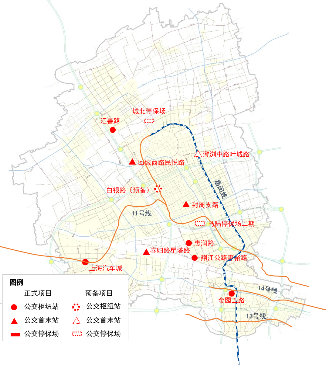 地面公交:新建汇善路站、惠润路站、翔江公路惠裕路站、上海汽车城站、14号线金园五路站配套公交枢纽等;新建回城西路民悦路、春归路星塔路、封周支路等公交首末站;储备城北路停保场、马陆停保场二期;加快推动新能源公交车辆更新;推动公交电子站牌建设。