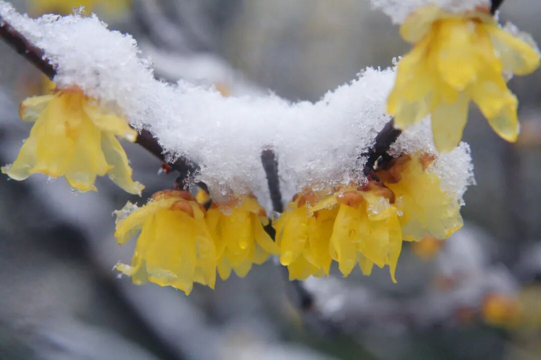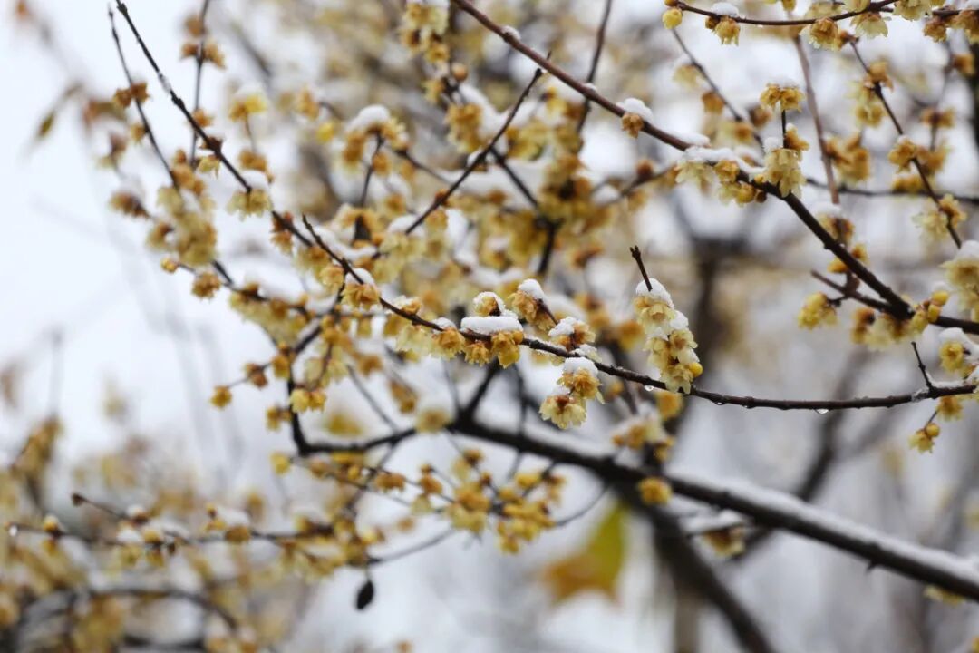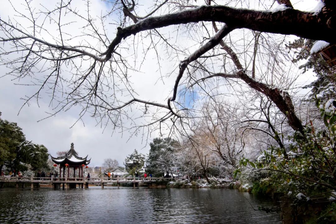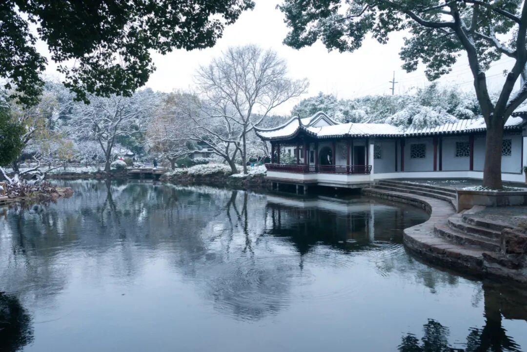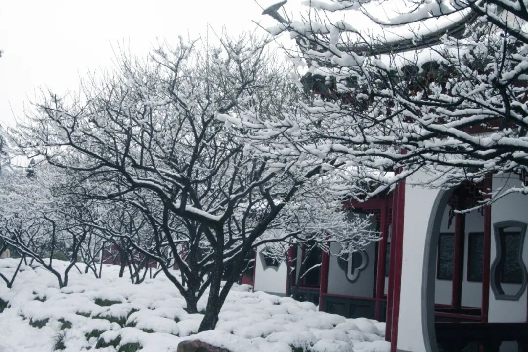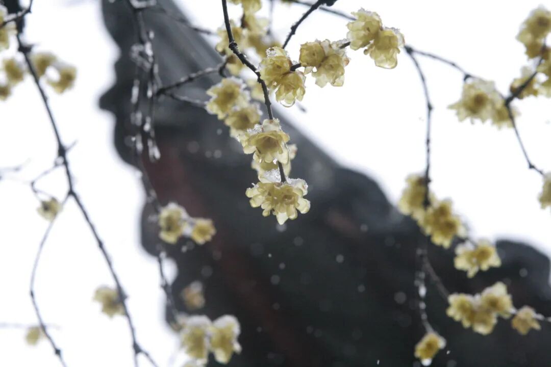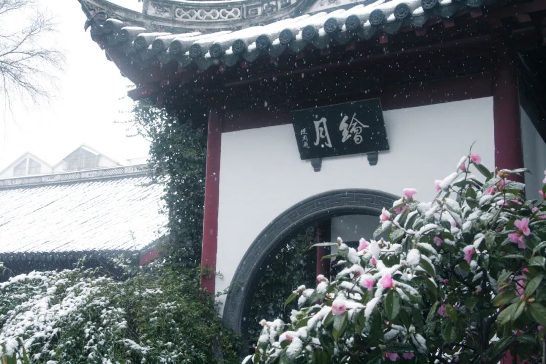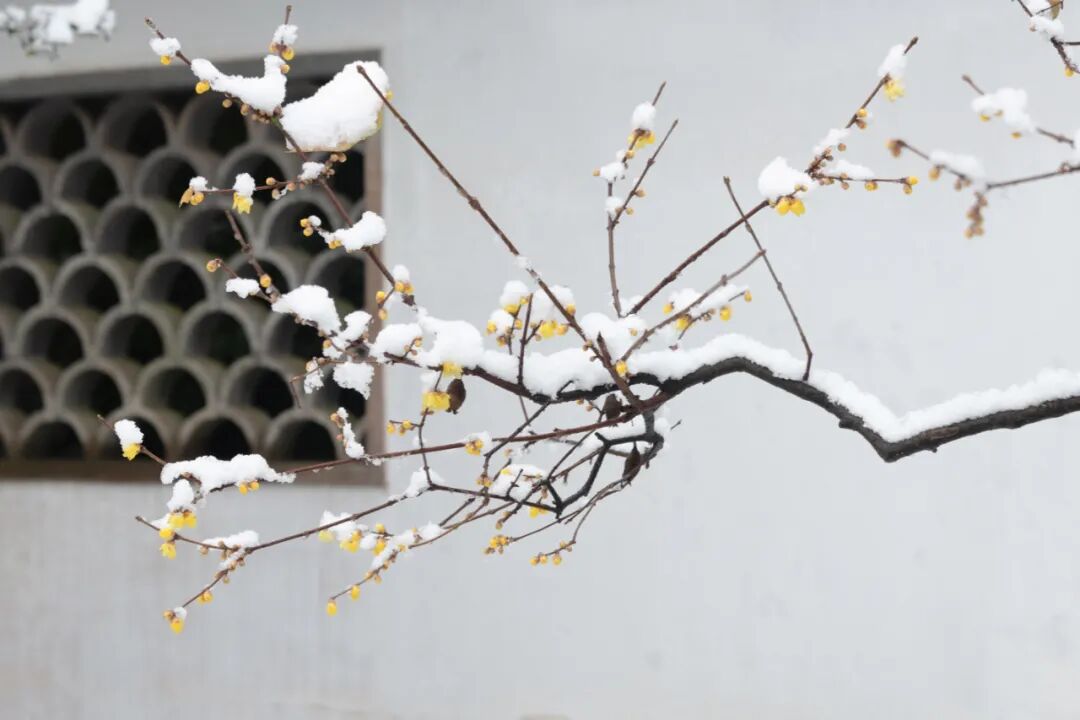 雪后初晴,古猗园在冬日的阳光里晶莹剔透,梅花厅四周的梅树落满了雪,雪在枝桠之间朵朵绽放。绘月廊前的翠色被覆上了一片银白,山茶花映衬着雪更显得粉面含羞。腊梅更不消说,娇嫩的鹅黄从冰雪之中探出头来,花瓣上还沾着冰晶,透亮如玉雕,楚楚动人。