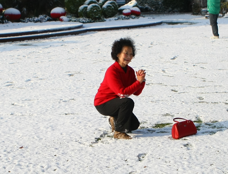 一场雪会让南翔人变成孩子。我在古猗园的雪中邂逅过一位老人,红毛衣红包包,涂着鲜艳的口红和指甲,她捧起一把雪撒过头顶,欢快的神情一如孩童。她让我帮她拍照,说好久没有见到这么大的雪,虽然已经年逾八旬,但老人玩兴丝毫不减,她的天真大大的感染了我,让我更觉得南翔的雪可爱,南翔的人可爱。