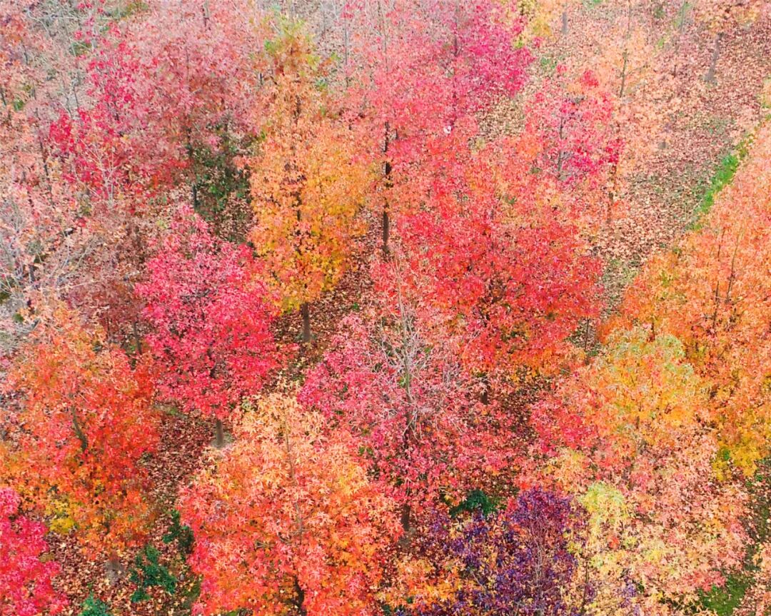 这里种了近百个品种的彩叶树,其中以栎树和槭树居多。由于品种不同,枫叶的颜色也不同,从绿色、橙色到紫色再到红色,整片树林都沉浸在色彩的海洋中。从高空俯瞰,仿佛一团星火,又好似一幅瑰丽的油画。