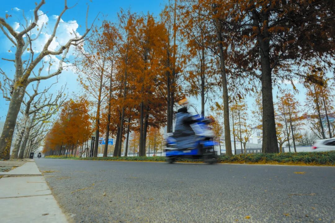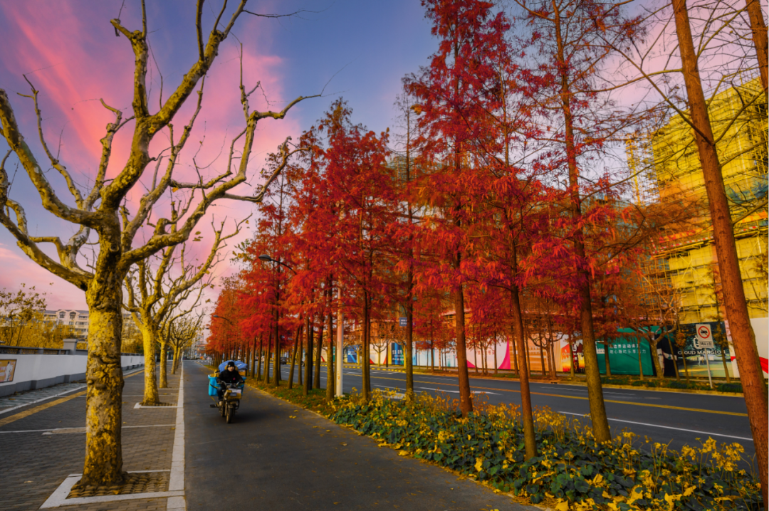 霜竹公路(嘉行公路-徐星路)位于华亭镇,是上海首批开放式休闲林地之一,今年被评为2020年度上海市十大美丽公路。初冬时节,公路两侧夹道而立的水杉换上了绚丽的“新装”。路是霜竹路,树是水杉树,红与黄是属于霜竹公路的色彩。