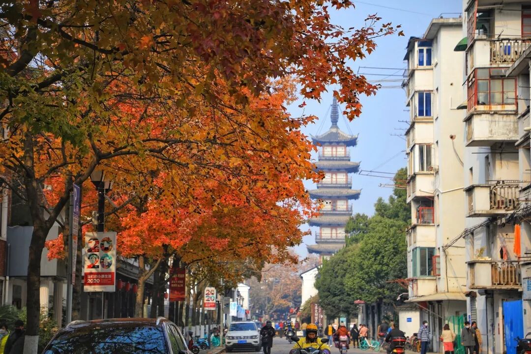 嘉定南大街长着一排枫香树,如今已完全变色。从远处眺望,红枫映衬着历经了八百多年风霜的法华塔,沧桑中透着几许浪漫。