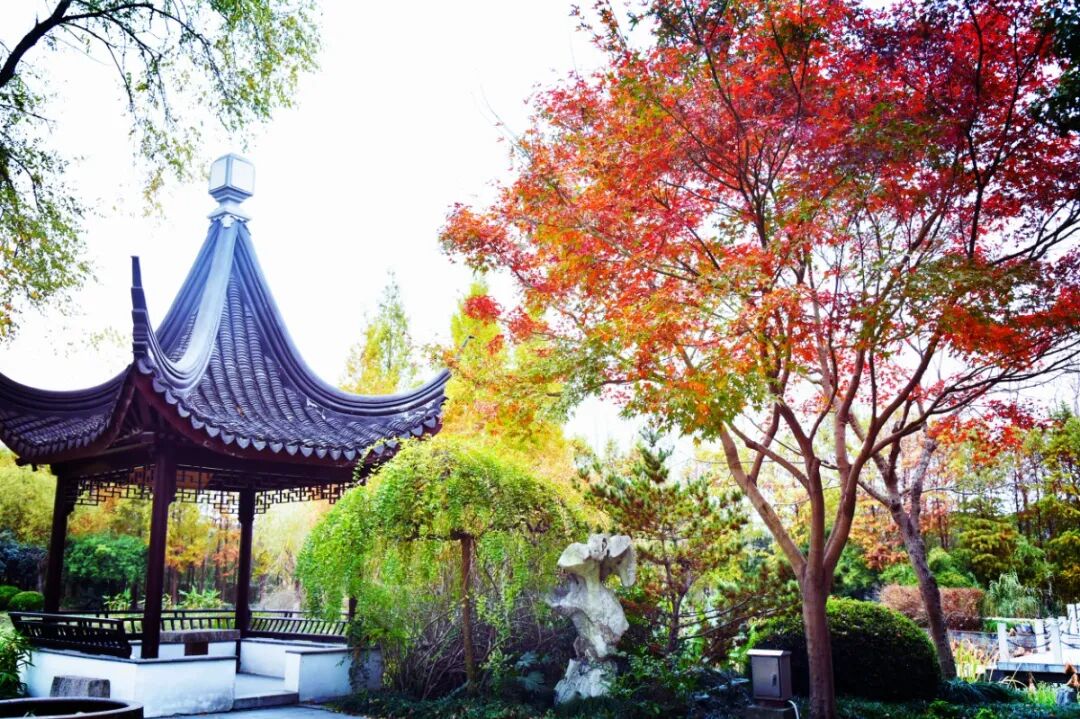 红彤彤的枫树与园中的亭台楼阁、小桥流水、林荫小道相映成趣,别有一番韵味。