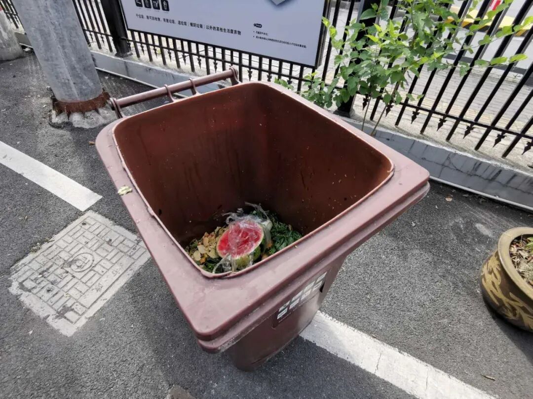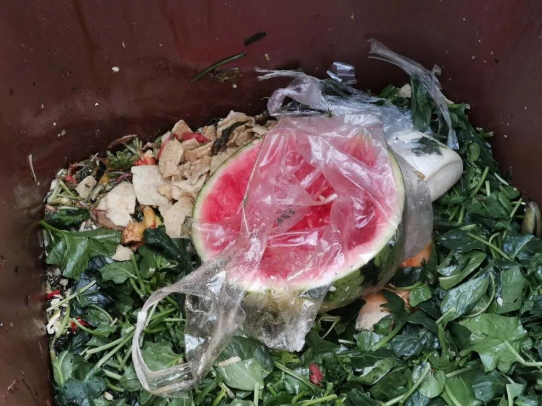 当事人将西瓜皮连带塑料袋扔进湿垃圾桶里