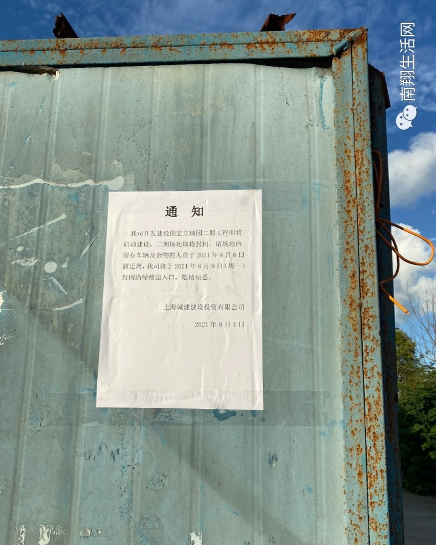 我司开发建设的宏立瑞园二期工程即将启动建设,二期场地即将封闭,请场内留存车辆及杂物的人员于2021年8月8日前迁离,我司将于2021年8月9日(周一)封闭延绿路出入口,敬请知悉。