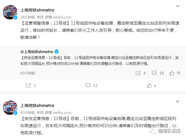 嘉定小伙伴今早坐11号线受影响了吗?   上海申通地铁集团有限公司运营管理中心官方微博“上海地铁shmetro”24日上午发布“突发运营信息”,上海地铁11号线因供电设备故障,嘉定北站至嘉定新城区段列车限速运行,发车班次间隔延长,预计晚点时间10分钟,请乘客们及时调整出行路径,以免耽误行程。   随后,“上海地铁shmetro”再次发布运营调整信息,11号线因供电设备故障,嘉定新城至嘉定北站区段列车限速运行,停站时间较长,请乘客们听从工作人员引导,耐心等候。给您的出行带来不便,敬请谅解!