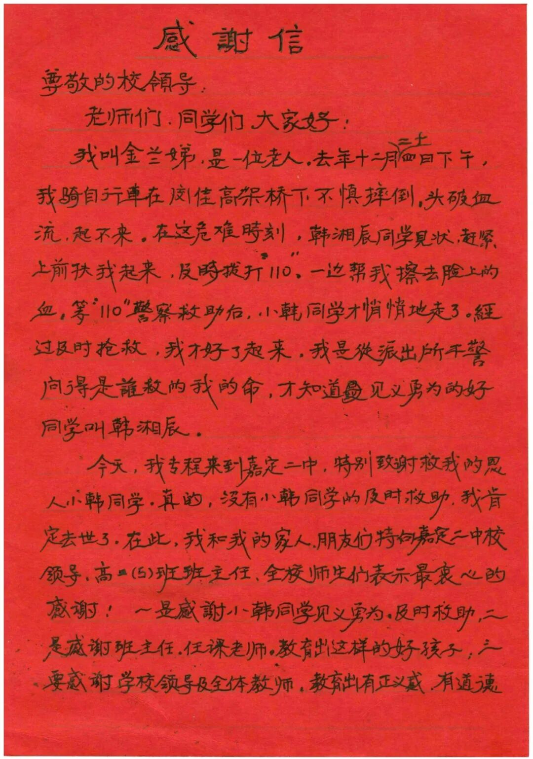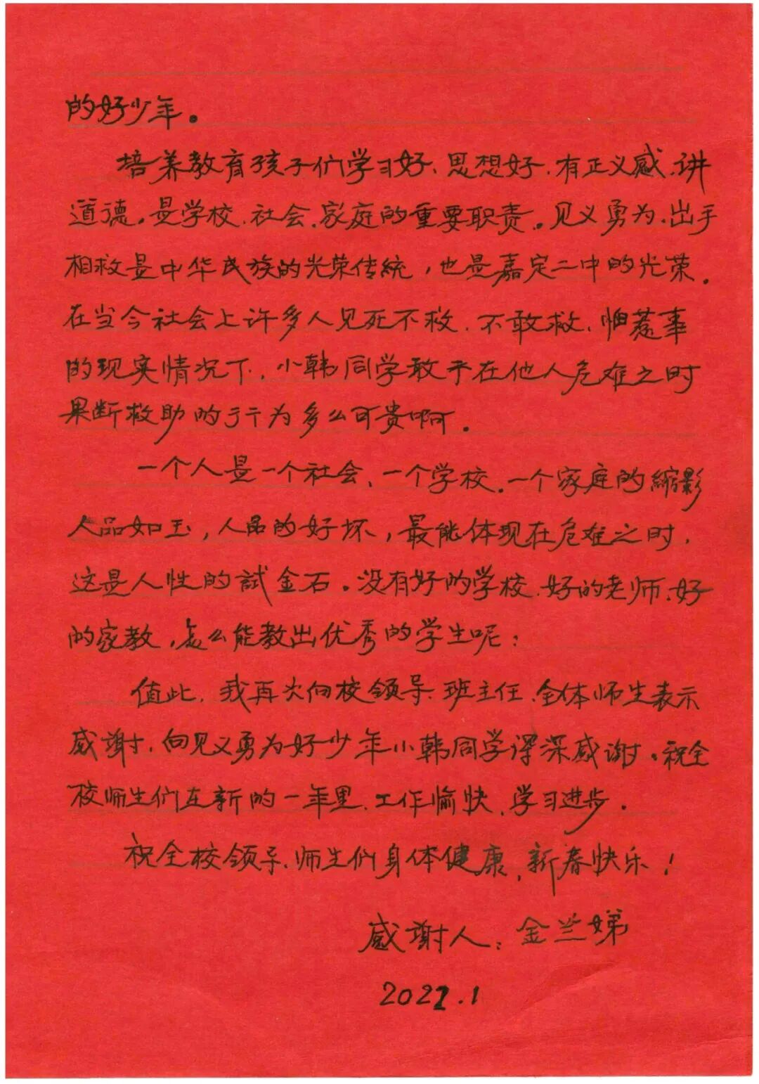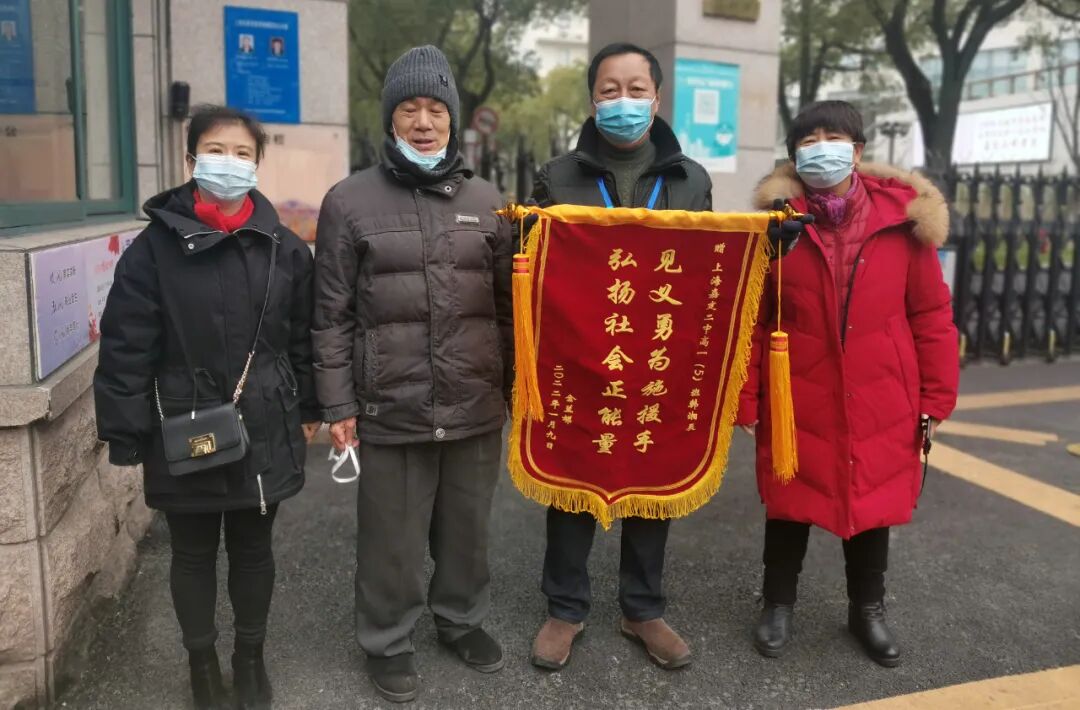 1月10日早上,嘉定二中收到市民金女士一家人送来的一封感谢信和一面绣着“见义勇为施援手,弘扬社会正能量”几个大字的锦旗,以此感谢学校高一(5)班韩湘辰同学对其家中老人的热心救助。