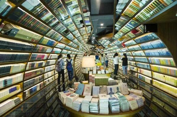 扬州的钟书阁以藏书阁的样式展现奇幻色彩,仿佛一下被吸入了书籍的魔法世界,光泽的大理石地面,倒映出拱顶式的设计。