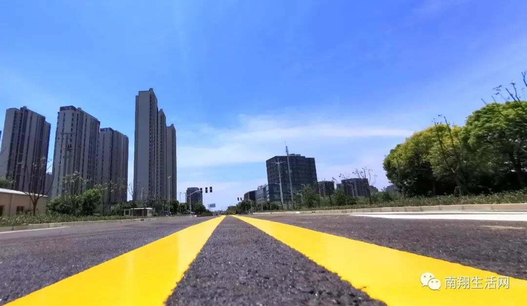 可以看到道路上的标线已画好,还有点油漆未干的痕迹。