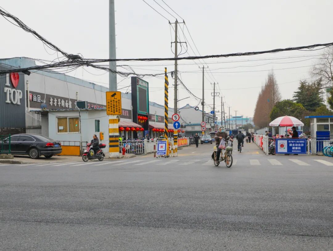 跨过围挡,可以看到里面的红绿灯设备已经安装好,机动车和非机动车行驶提示牌也安装完毕。