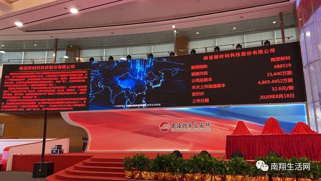 根据上交所公告:该公司A股股本为23,440万股,其中4,865.4452万股于2020年8月18日起上市交易。证券简称为”南亚新材”,证券代码为”688519“。发行价32.6元/股。     南亚新材也就此从今日起,成为上海嘉定又一家上市公司,同时也是南翔第一家 登陆科创板企业!   董事长包秀银先生致辞   无卤覆铜板销售全球前十 据南翔生活网了解,公司主要从事覆铜板和粘结片等复合材料及其制品的设计、研发、生产及销售。在二十年的发展历程中,公司陆续实现了材料无铅无卤化、超薄化、高频高速等技术的重大突破。   公司的无卤覆铜板销售已跻身全球前十、境内本土厂商第二;超薄工艺及可靠性处于国内先进水平,并得到全球PCB多层板龙头企业之一健鼎集团的高度认可;高速板技术已获得华为、中兴等通信设备龙头企业认证。   本次在A股发行上市,将是南亚新材发展历史上一个重要里程碑。