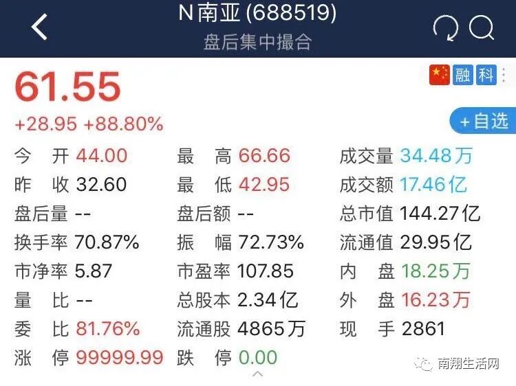 掌握核心技术的高科技企业 经过长期的技术创新积淀,南亚新材形成了一系列与下游电子信息产业相适应的核心技术,包括无铅配方技术、无卤配方技术、高频高速配方技术、车载配方技术、高导热配方技术和IC封装配方技术等配方技术,以及填料分散技术、树脂浸润技术、超薄粘结片生产技术、耐电压控制技术和尺寸安定性控制技术等生产工艺技术。目前,公司已掌握实施5G通讯等领域用高频高速电子电路基材建设项目所需的高频高速配方技术,并已具备生产该类产品的技术实力及相关技术的持续创新能力。   今日现场花絮实拍   今日收盘,股价暴涨88.8% 截止今日收盘,南亚新材料科技股份有限公司股价由32.6元/股上涨至61.55元/股,大涨88.8%