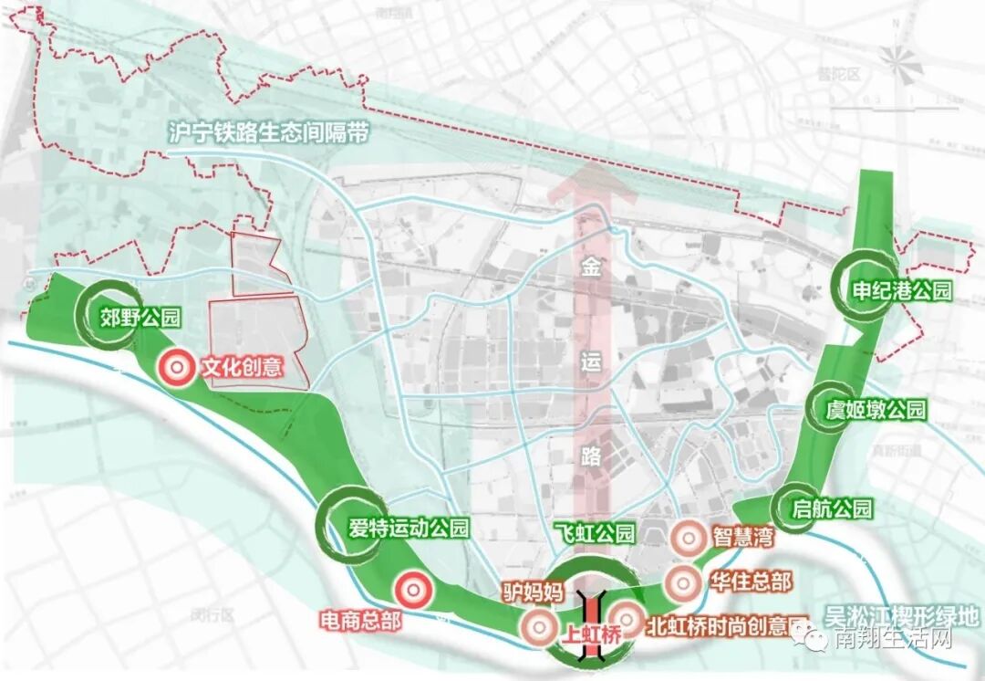 据悉,除此以外,这个绿带上,江桥还将会有申纪港公园、双桥公园、启航公园、上虹公园、金鹤公园、运动公园、郊野公园等公园设想,可以说江桥就是一个把居住、办公融入在公园之中的江南小城。