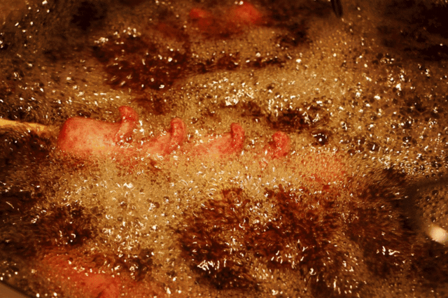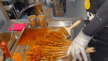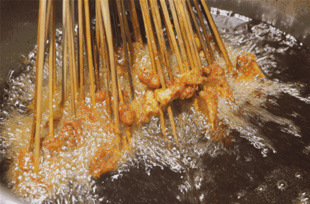 在二十多种草本香料熬制的草本卤油中,用5个独家炸串手法,炸、抖、刷、撒、点,还原炸串的味道。