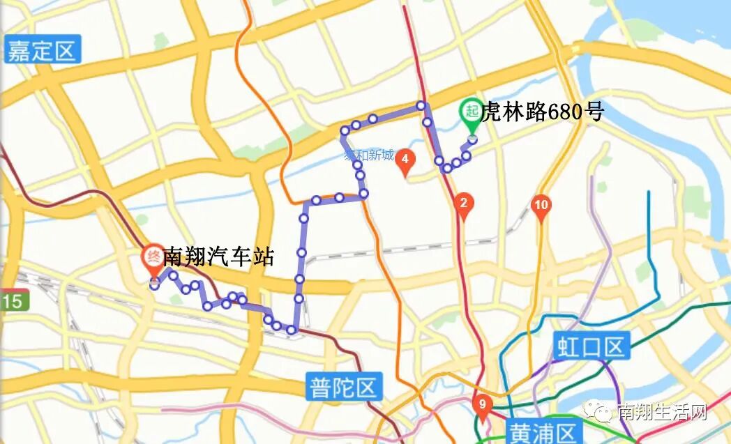启程:虎林路呼玛路、爱辉路长江西路、通河新村、长江西路通河路、共和新路呼玛路、共富路蕴川路、联泰路泰和西路、泰和西路盛新路、泰和新城、顾村、塘桥(沪太路)、东方国贸、沪太路锦秋路、锦秋路南陈路、锦秋路瑞康路、祁连新村、祁连山路南大路、祁连山路沪嘉高速公路、祁连山路古浪路、真南路祁连山路、真南路敦煌路、真南路武威路、雪松路武威路、桃浦五村、武威路郁李路、武威路金迎路、金迈路金迎路、金迈路众仁路、众仁路真南路、南翔汽车站