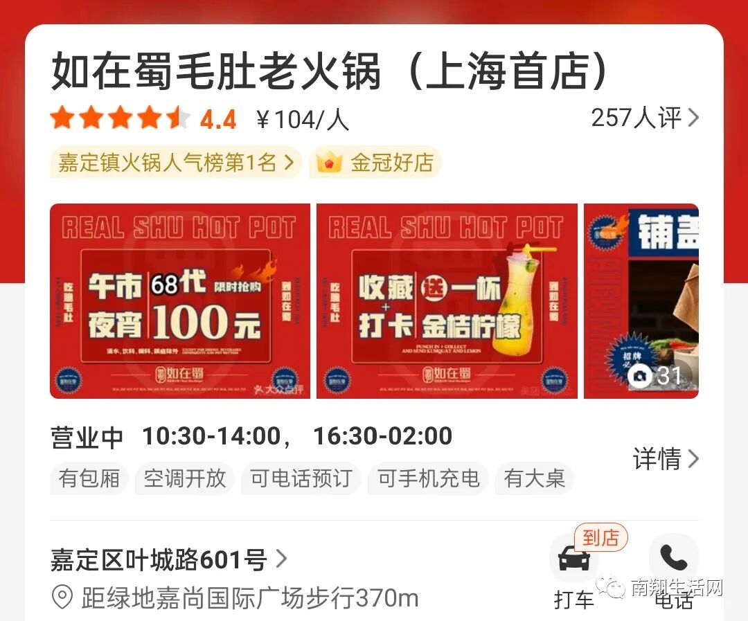 这部有望成为新热点的影片选择嘉定的生活时尚广场的如在蜀拍摄也不奇怪,这家主打脆毛肚的川式火锅店也和影片一样,非常火,其首店就放在嘉定,而且是高居第一的“金冠好店”!
